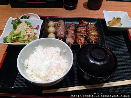 燒鷄定食有五串,包括鵪鶉蛋、免治雞肉、鹽燒雞肉、雞肉蔥串及醬燒雞肉。醬燒雞肉可能因為有沾醬,所以不算太熱,但調味剛剛好,不會過鹹。