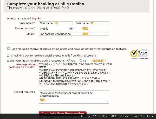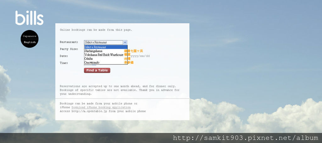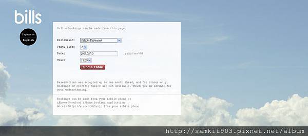 有人說旅程留下遺憾,讓你有下一次旅行的動力。半年後重回東京,其中一個主要目標就是要吃到bills!難得這次不是一人遊,當然要善用網上訂位服務。bills訂位非常簡單,先到官網,然後點english。最底一行是reservation,用力戳進去。