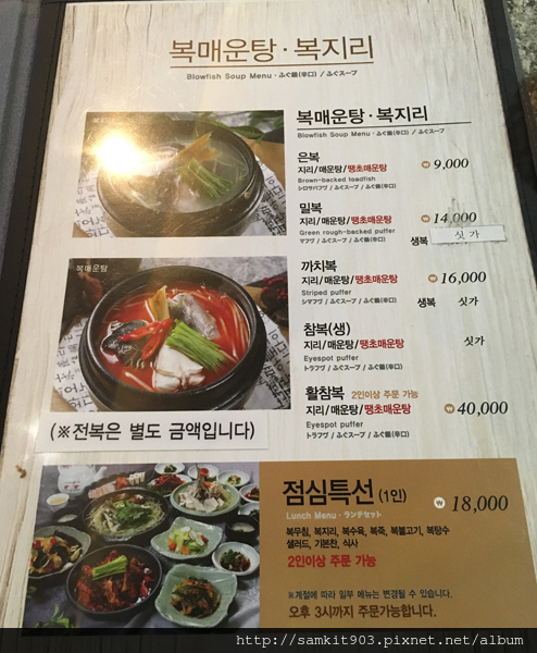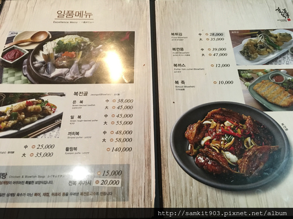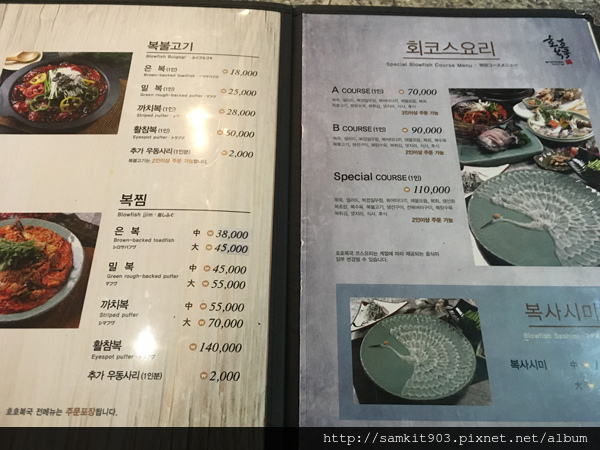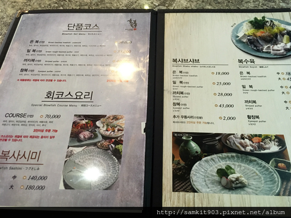 如果是一個人來用餐,其實選擇不多,要不就是第一頁的河豚湯,要不就是炸河豚排(복까스),其他都要二個人或以上。
