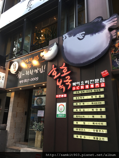 在日本吃了幾次河豚料理,想說還蠻喜歡這種口感的,得知釜山的河豚湯很有名,特別安排一頓試試。有一天在西面,發現有一家호호복국,姑且先譯作「好好河豚」。