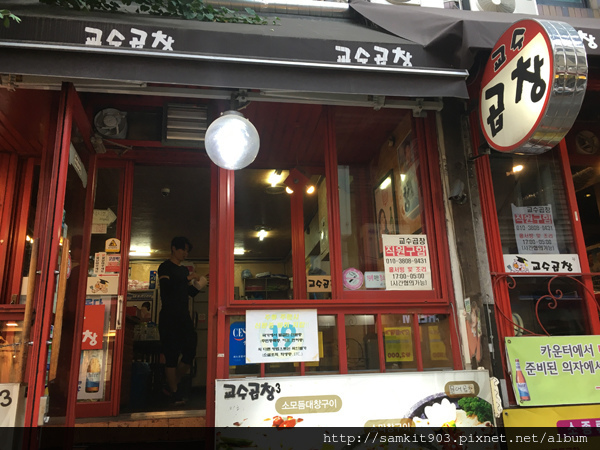 我很愛吃內臟類,所以一直很想在韓國吃吃烤腸,可是韓國不少烤腸店都是烤牛腸,為了不要誤吃了牛腸,我在網上搜尋了很久,終於找到一家有烤豬腸而又能一個人進食的烤腸店,就是弘大的教授烤腸(교수곱창)。