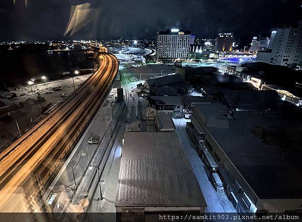 窗外是函館車站及函館港的景色。