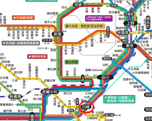 川崎不屬於東京都,而是神奈川縣,但其實看一下JR地鐵圖,她跟東京都的蒲田站只隔一個站,就是這一個站令她們一個是東京都,一個是神奈川XD 從羽田機場坐京急線最快16分鐘可抵達京急川崎站,即使沒遇上直通車,在京急蒲田換車,整體也只需要20分鐘左右,非常方便。